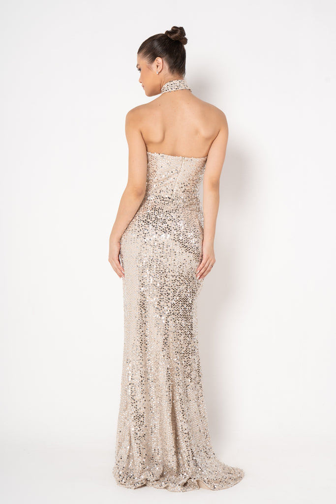 Turn heads in the Jory, a playful halter neck maxi dress designed for evening elegance. Its sleeveless cut and high slit add a flirty touch, perfect for dancing the night away or making a bold entrance. Embrace effortless style and confidence with this stunning statement piece.