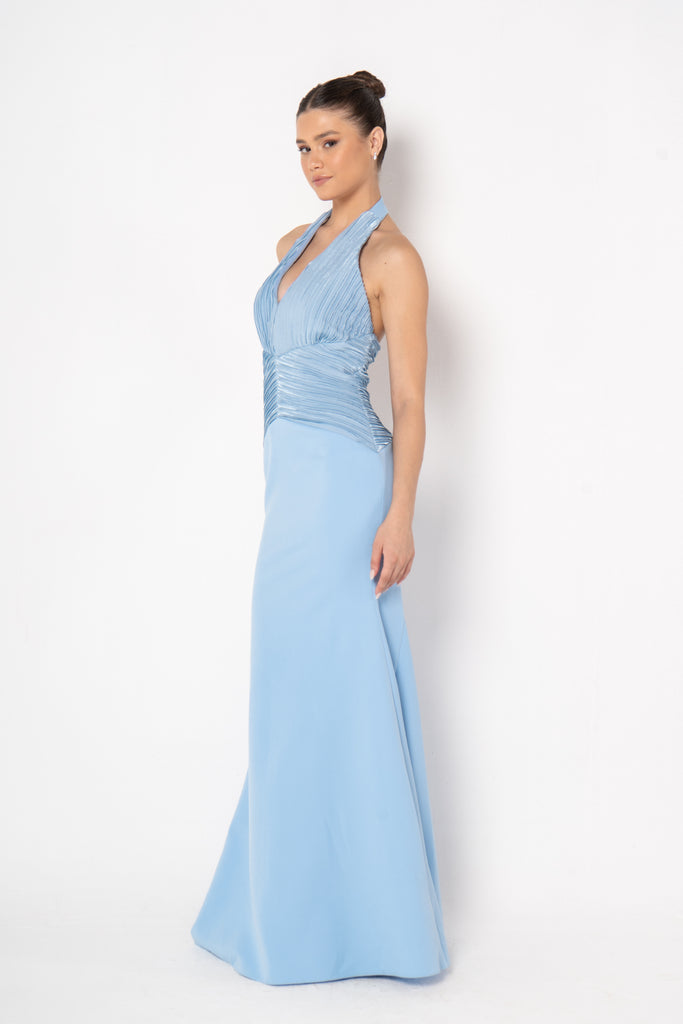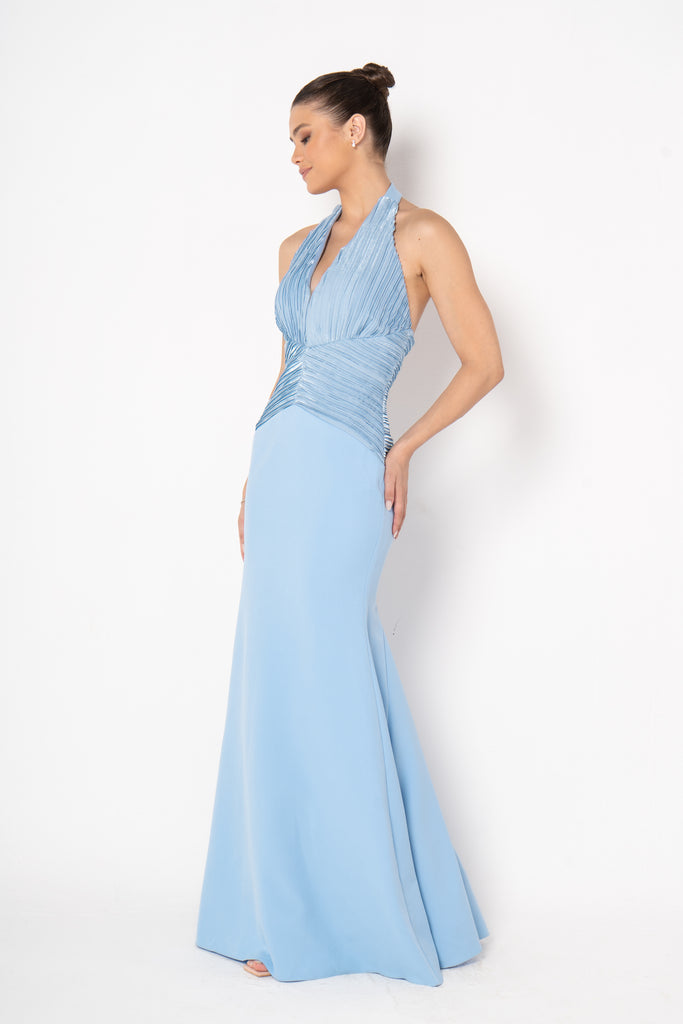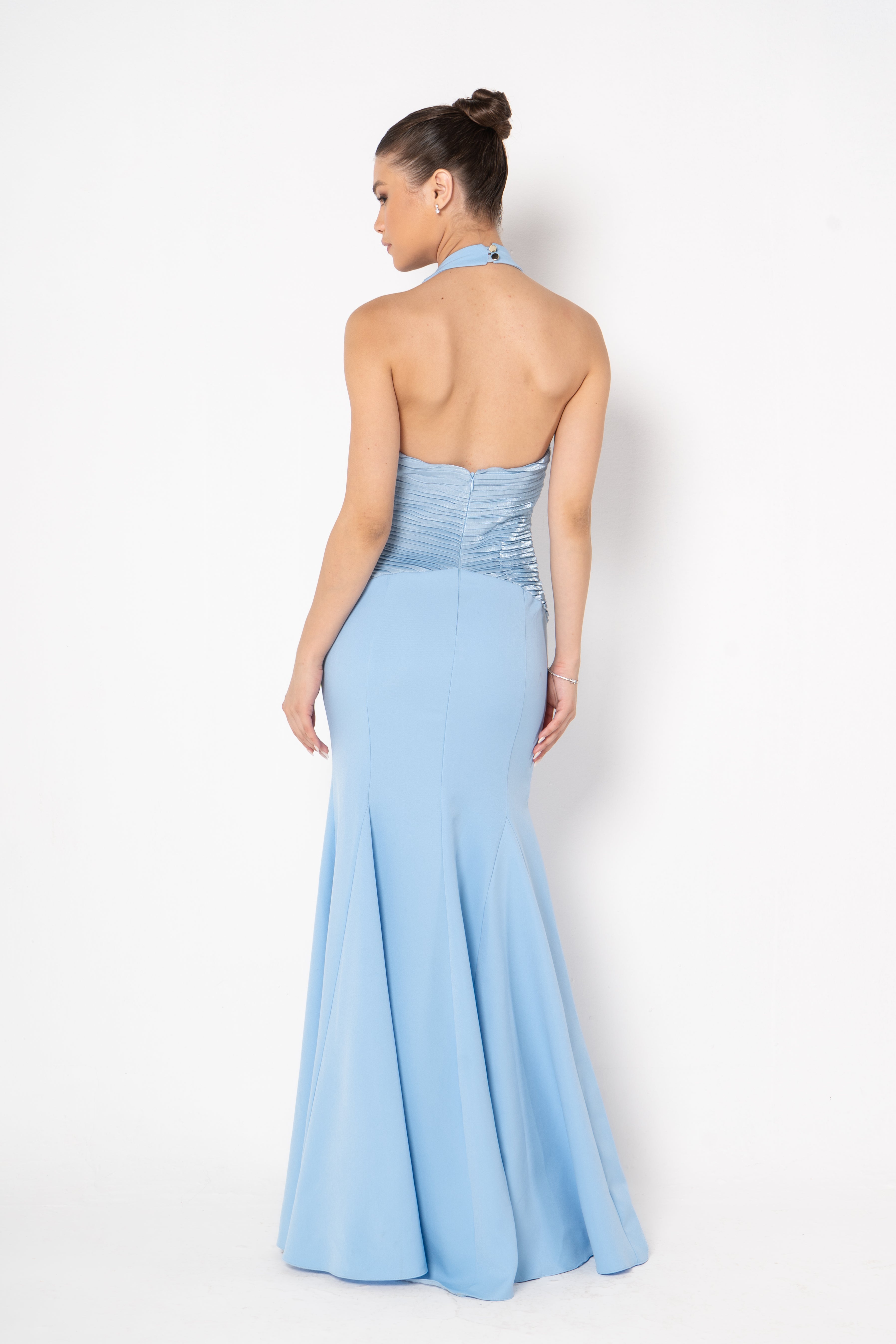Turn heads in the Noemi halter neck maxi satin evening dress. Its sleek satin fabric glides effortlessly, while the halter neck adds a flirty touch to your evening look. Perfect for twirling under the stars or making a grand entrance, this dress combines comfort and style for unforgettable nights.