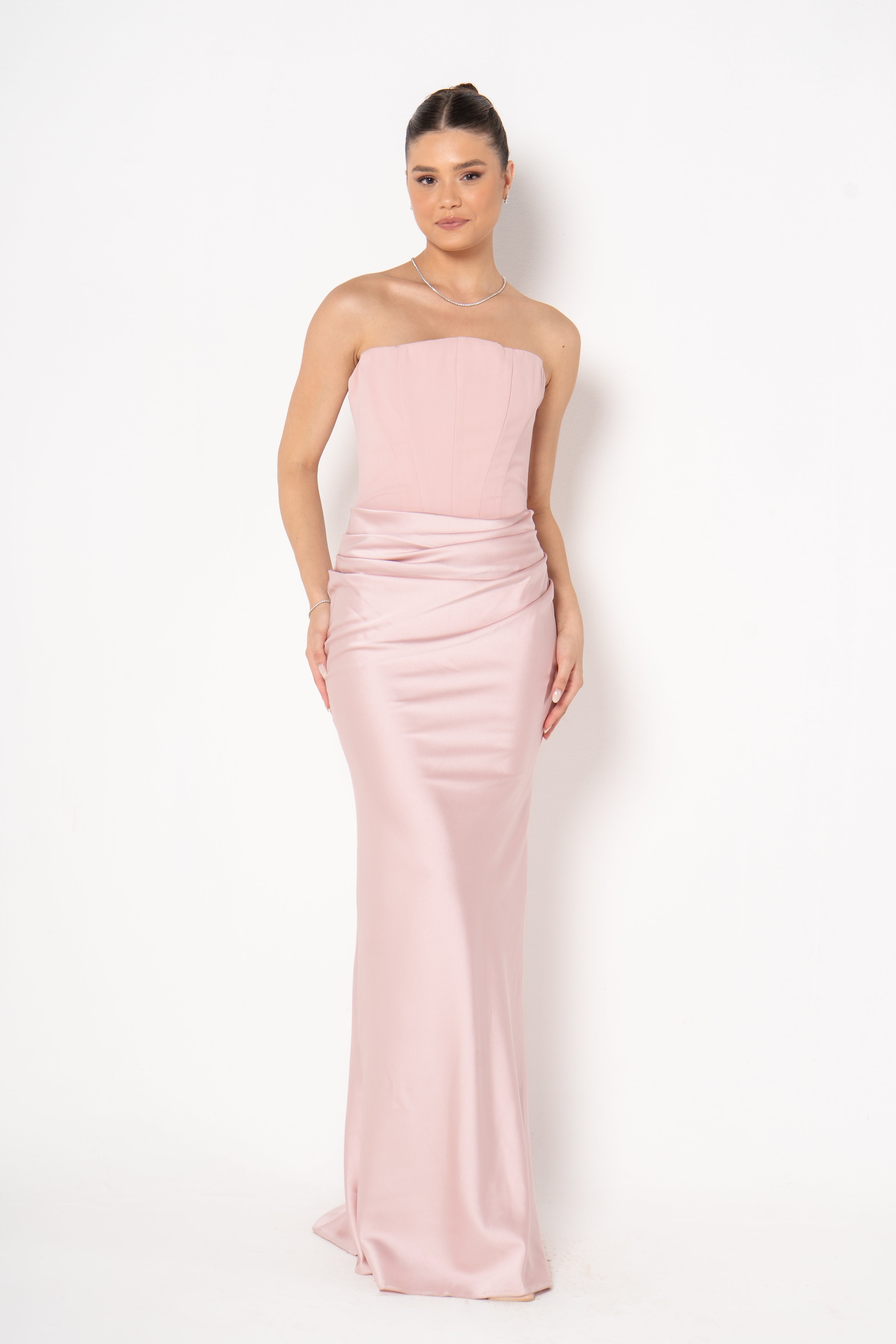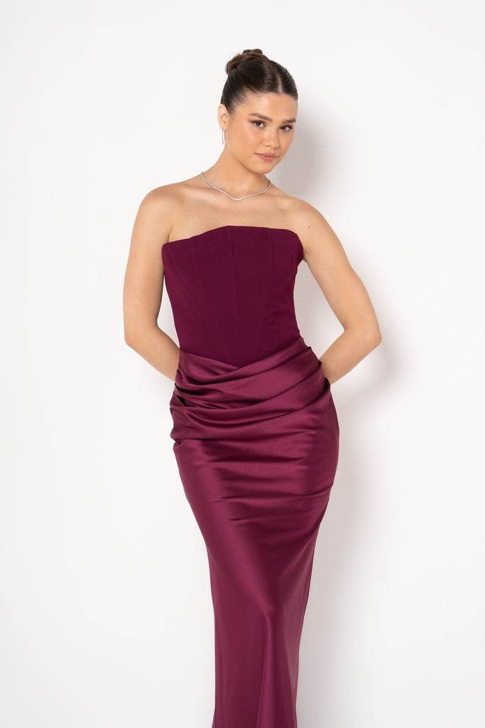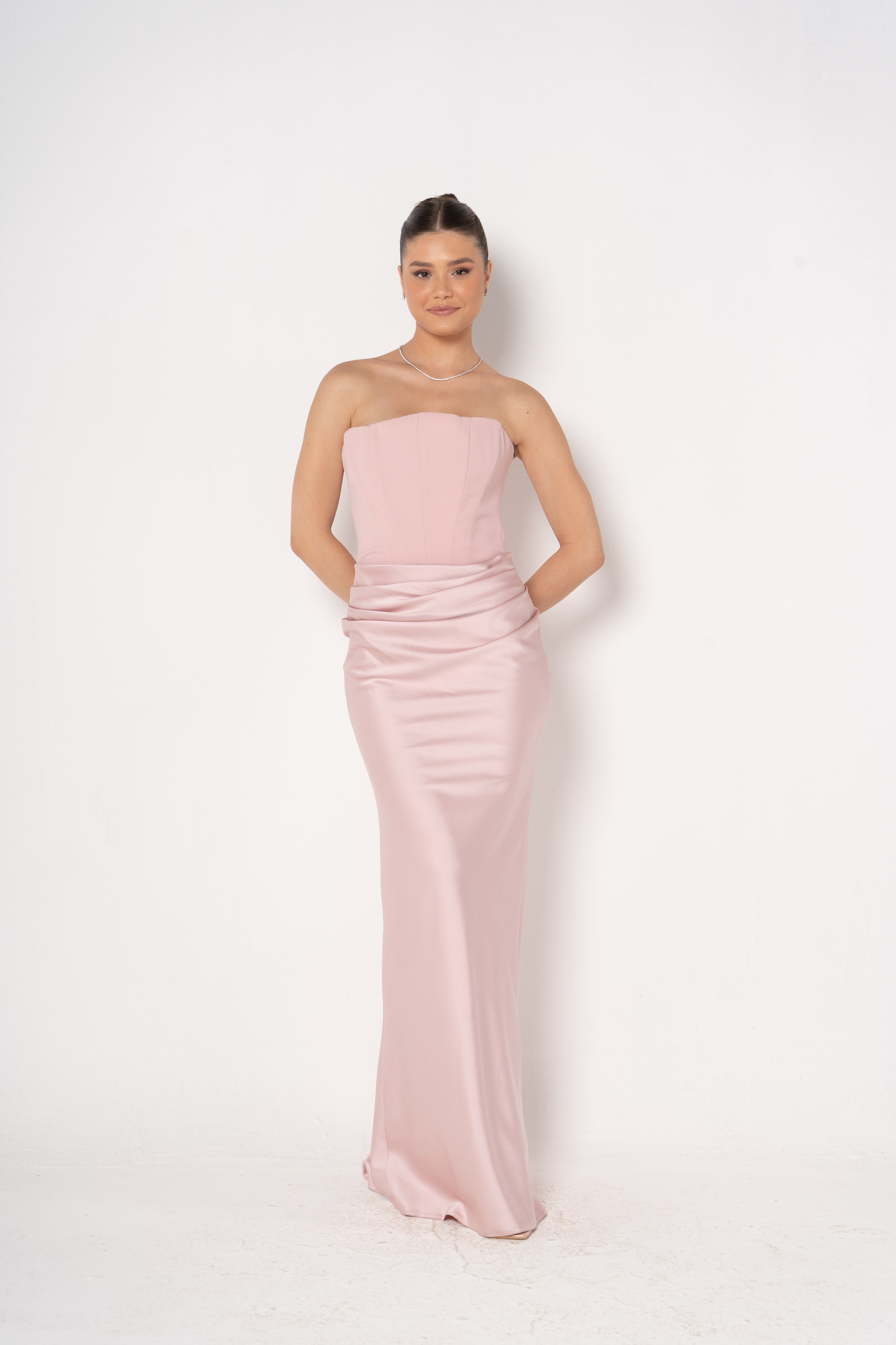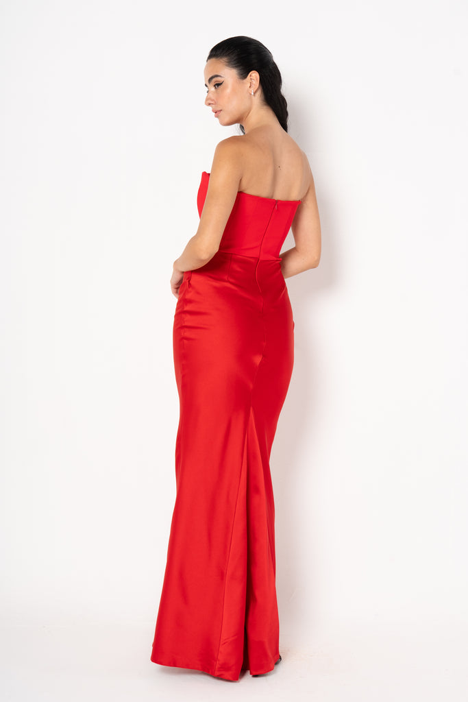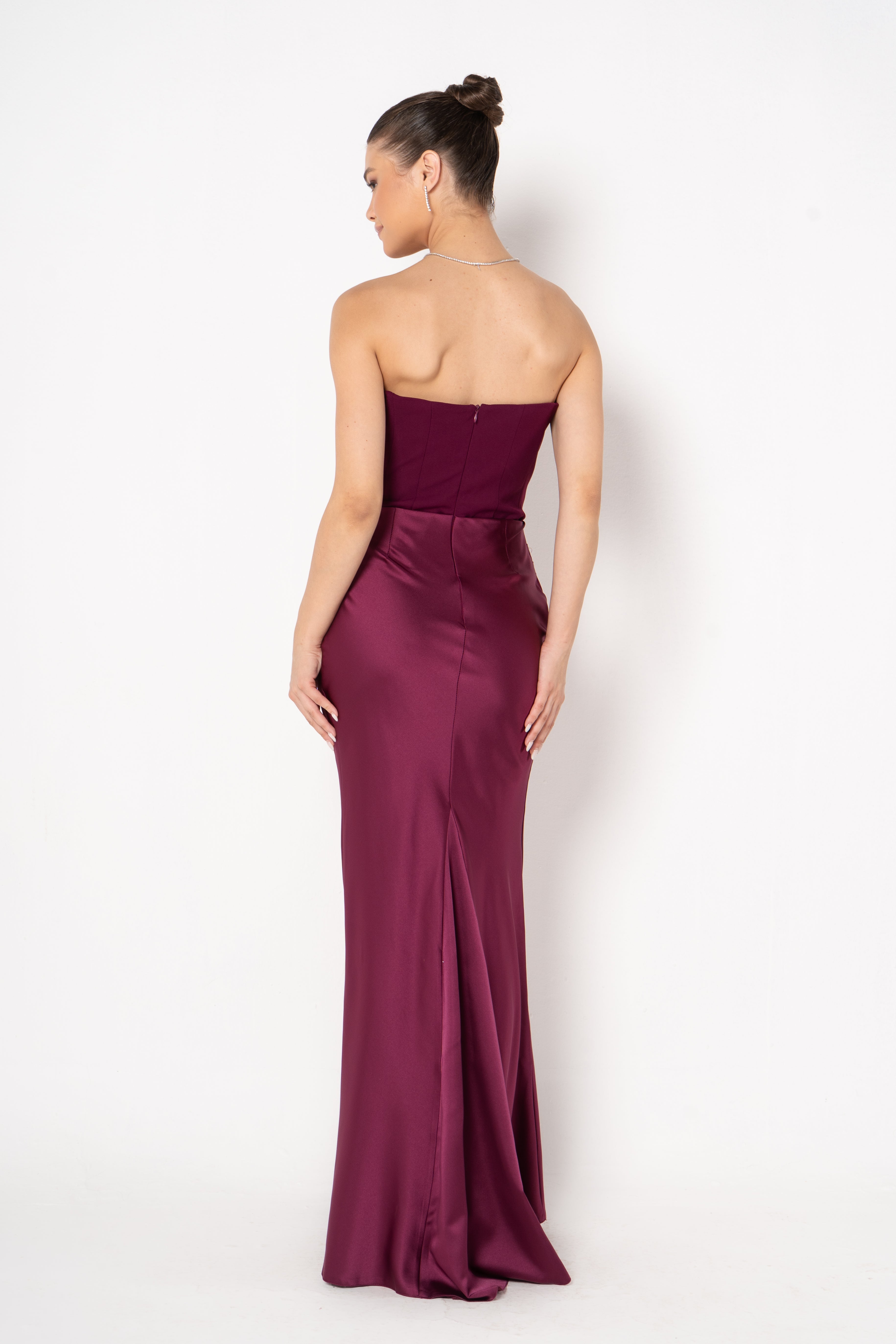 Unleash your inner goddess with Rhea, a strapless satin crepe maxi evening dress. Made with luxurious material, this dress will have you feeling elegant and sophisticated all night long. Perfect for any special occasion, Rhea is a must-have addition to your wardrobe.