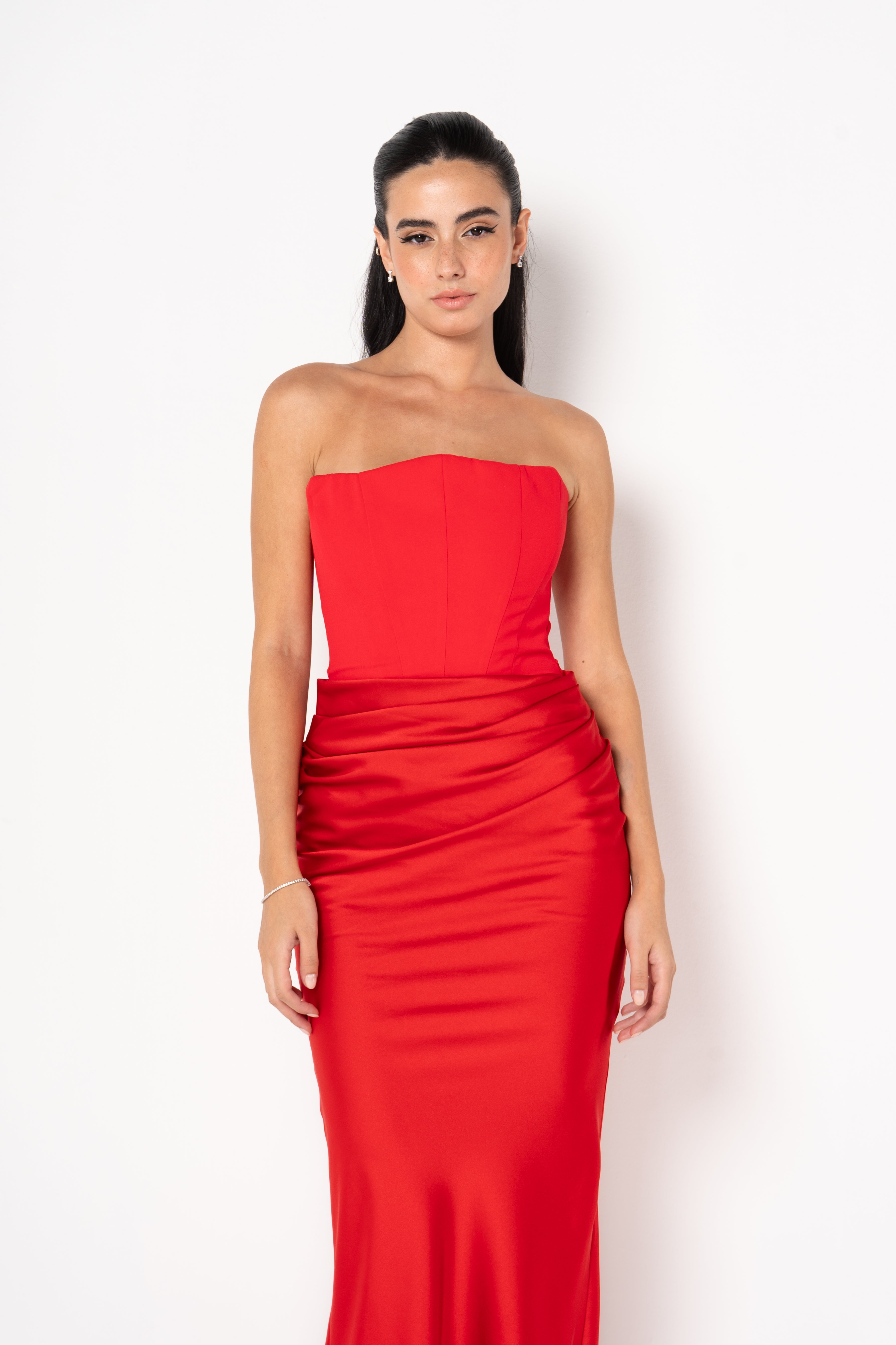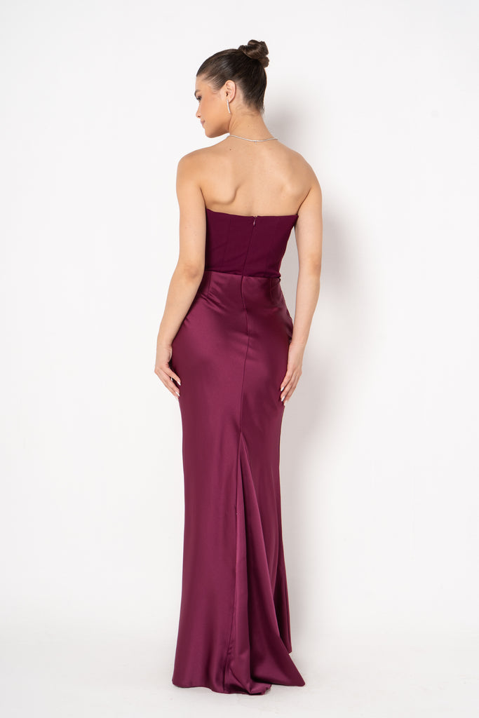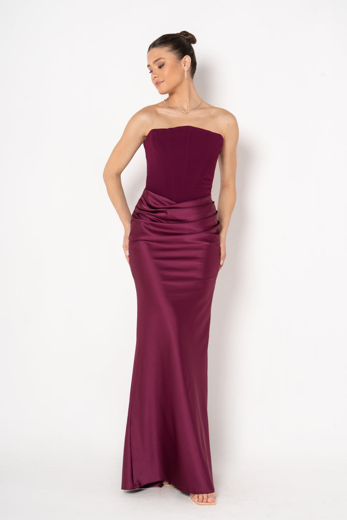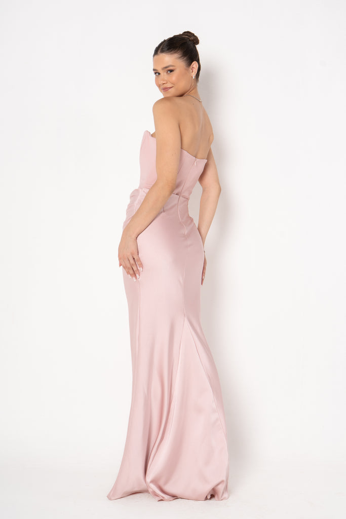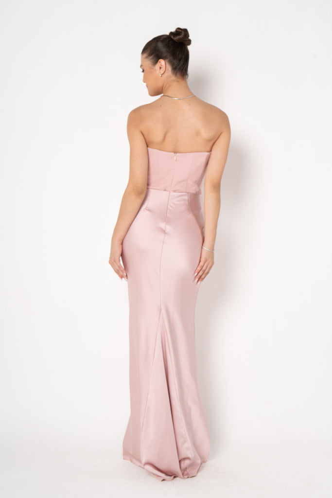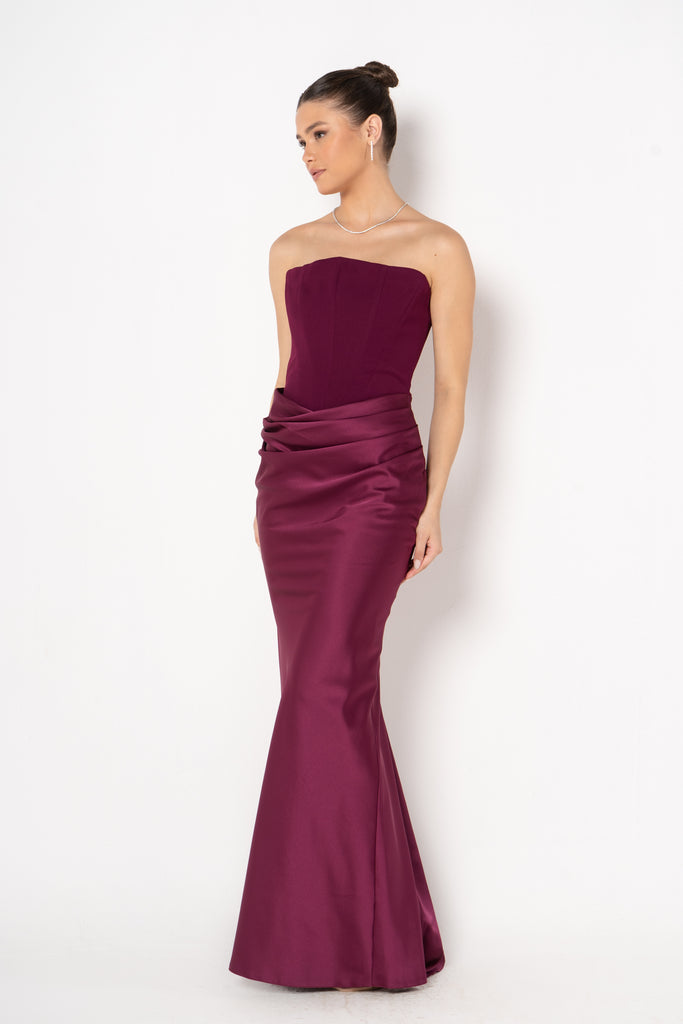 Unleash your inner goddess with Rhea, a strapless satin crepe maxi evening dress. Made with luxurious material, this dress will have you feeling elegant and sophisticated all night long. Perfect for any special occasion, Rhea is a must-have addition to your wardrobe.