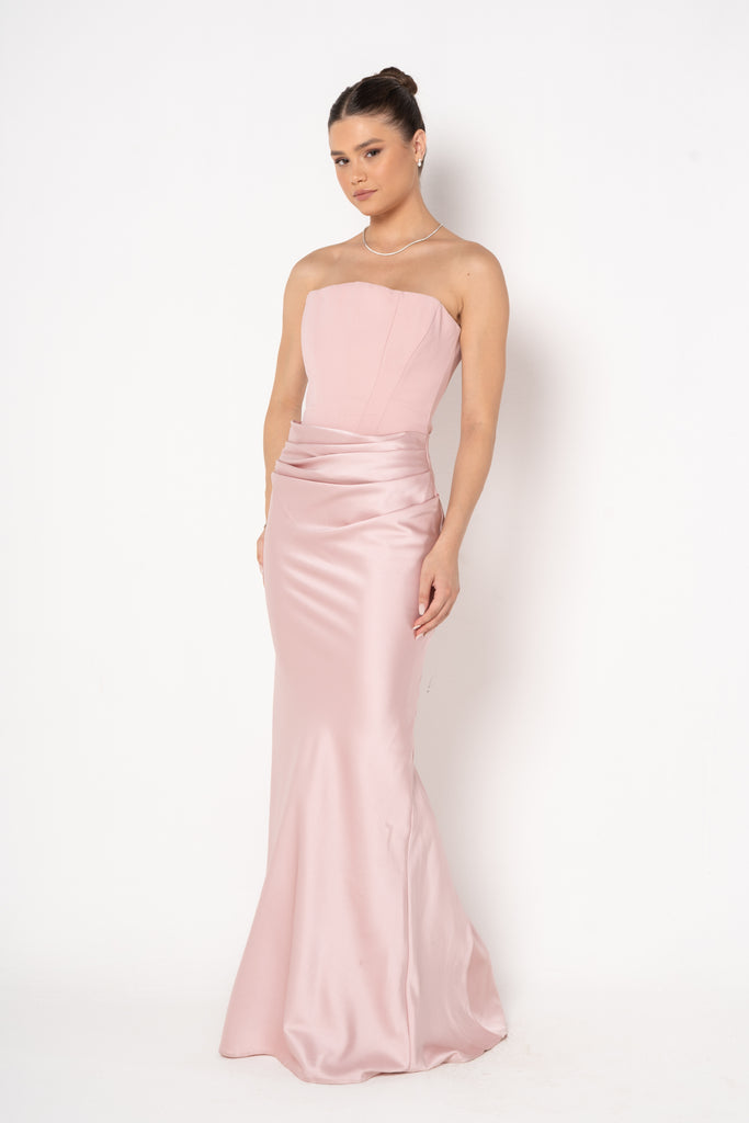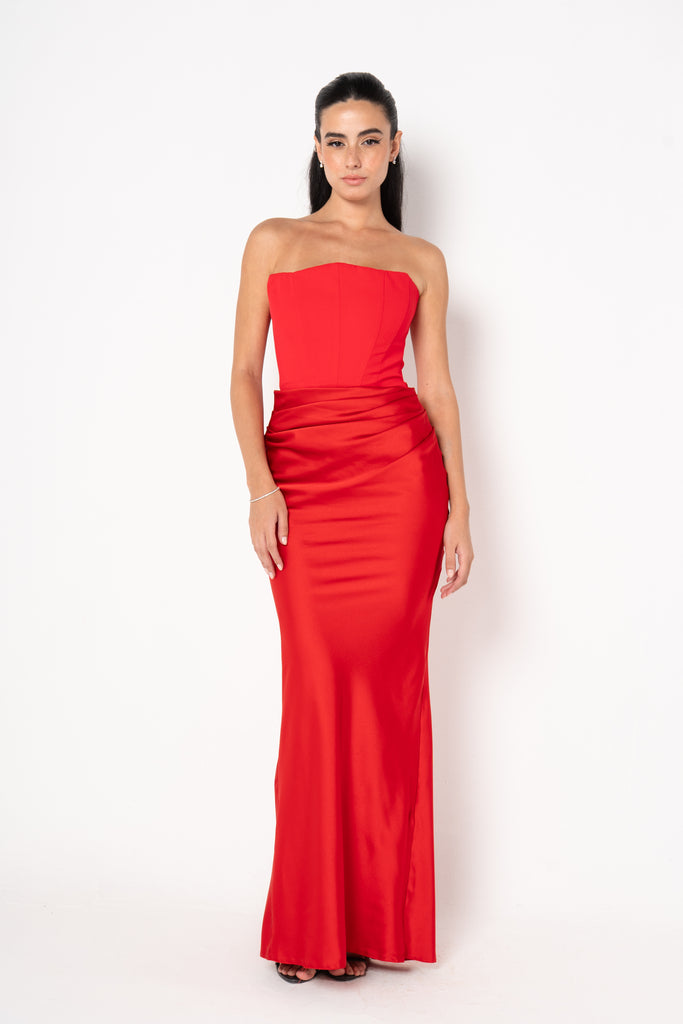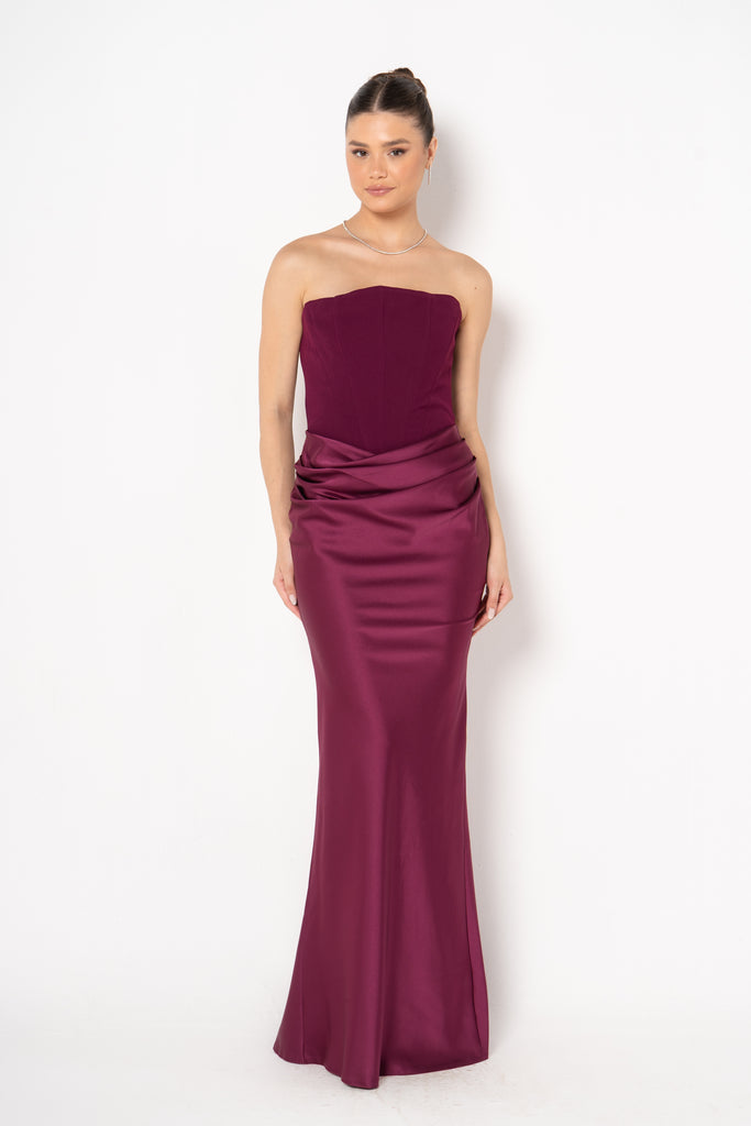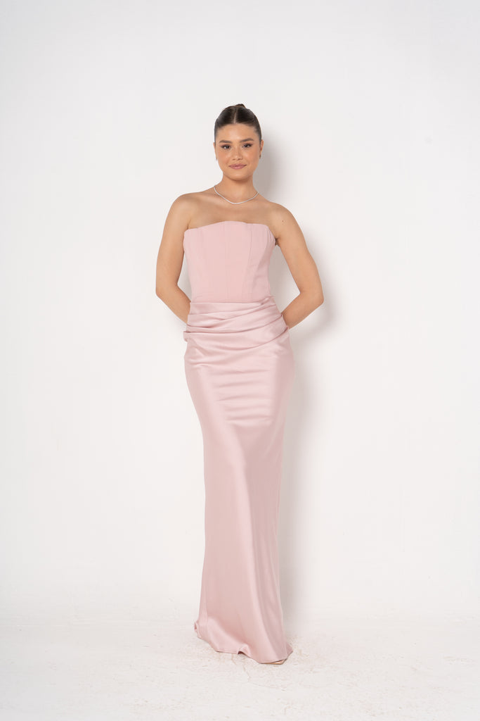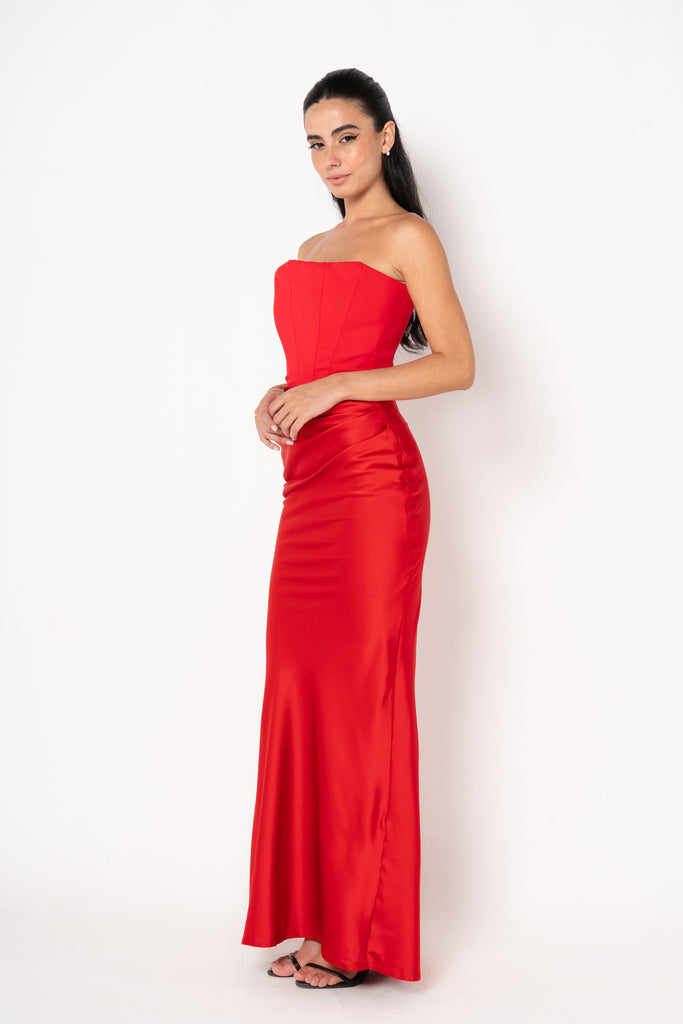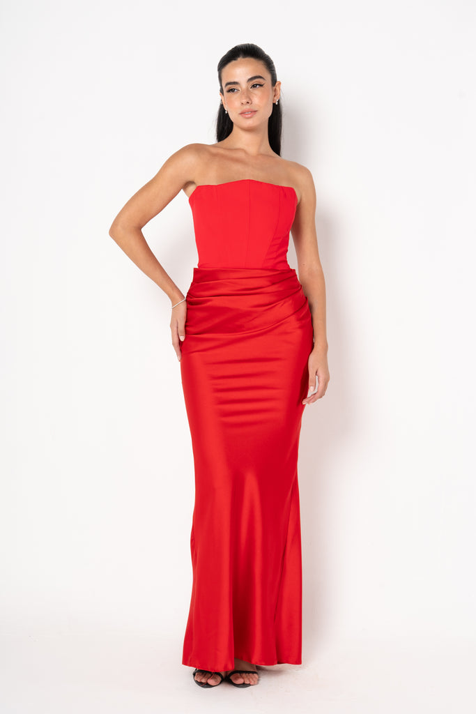 Unleash your inner goddess with Rhea, a strapless satin crepe maxi evening dress. Made with luxurious material, this dress will have you feeling elegant and sophisticated all night long. Perfect for any special occasion, Rhea is a must-have addition to your wardrobe.