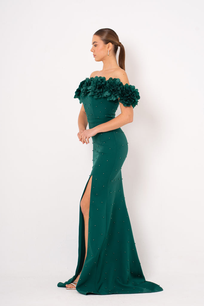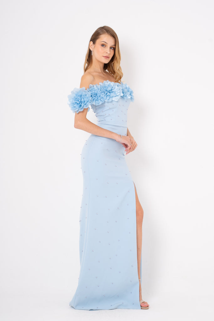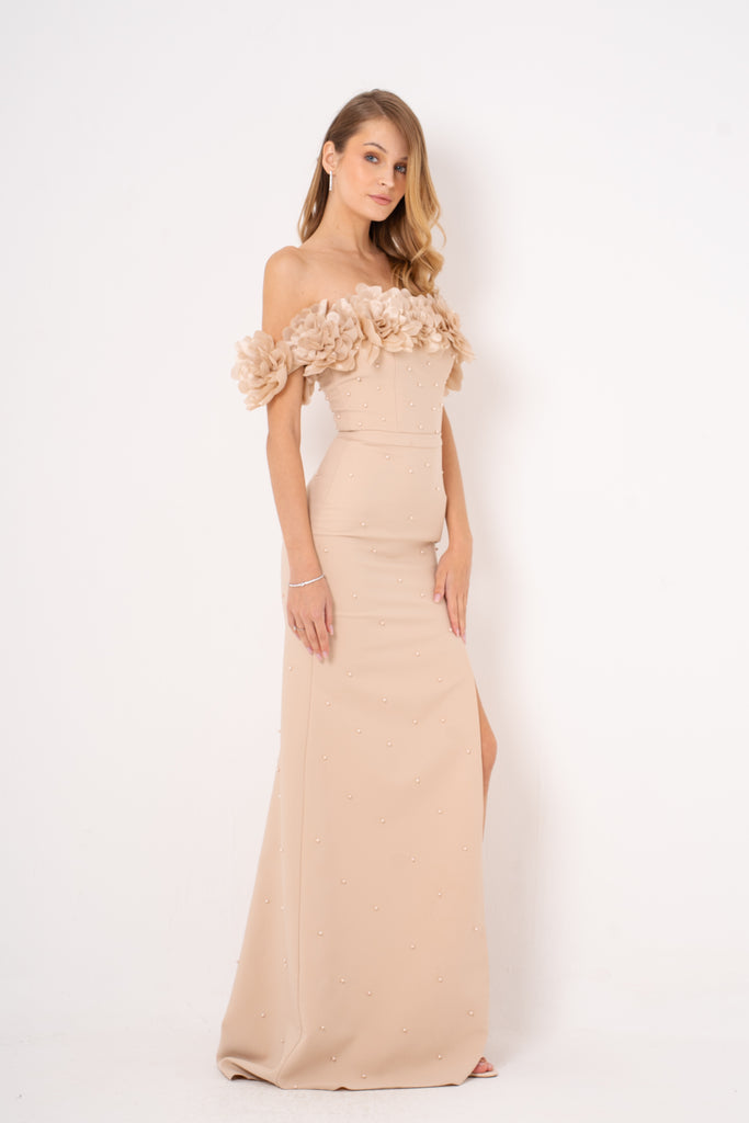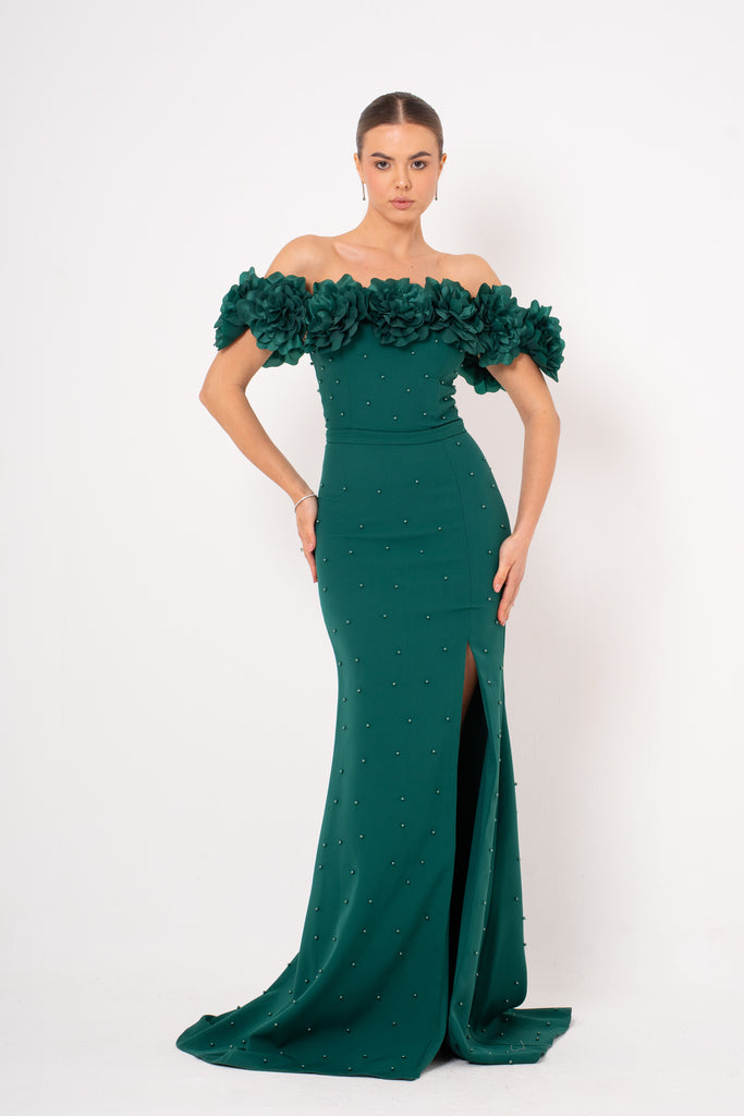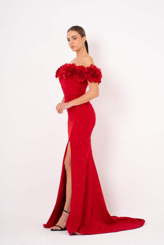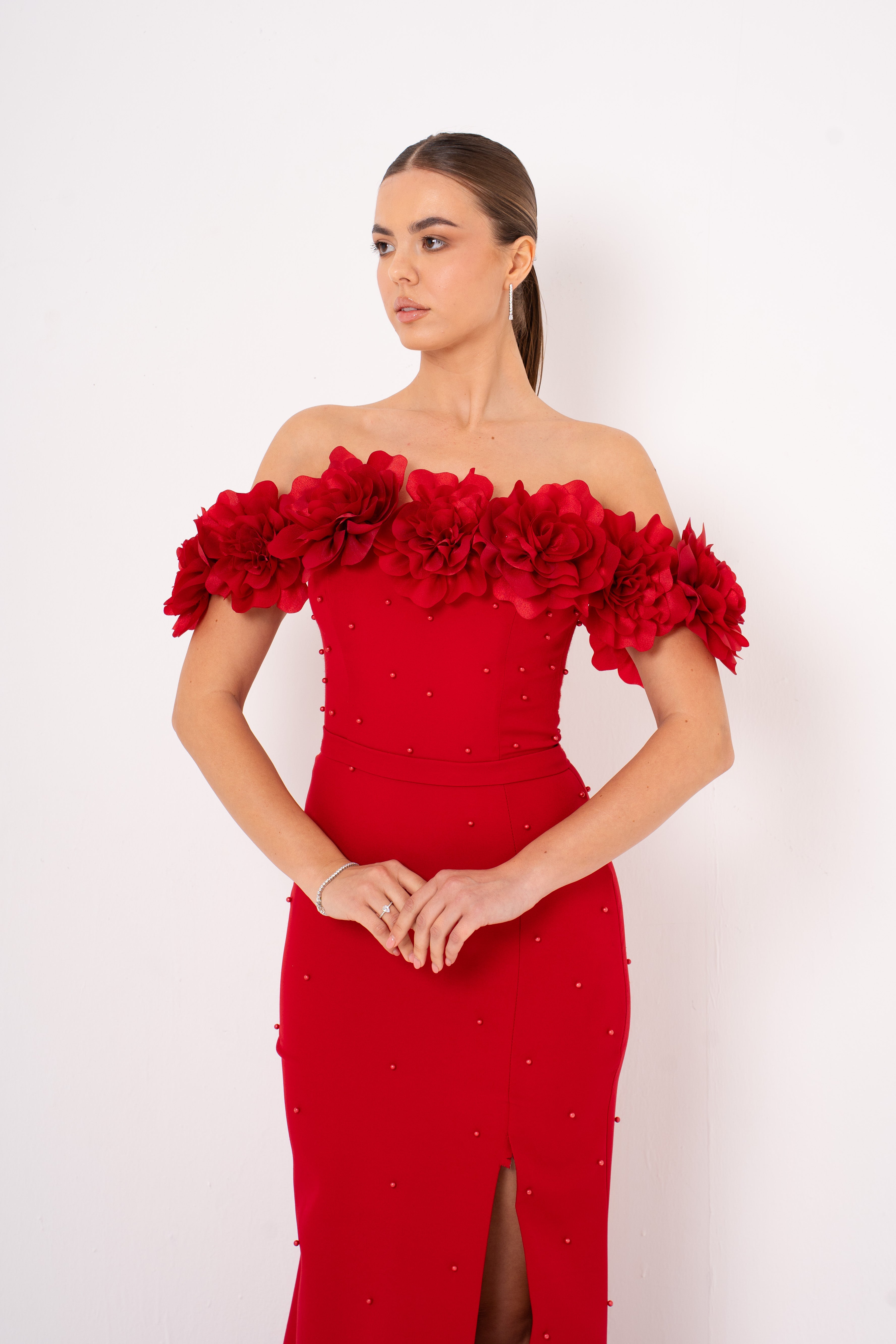 Introducing Sheere - the flower-powered maxi! Show off those shoulders and legs with this flirty and feminine off-the-shoulder dress featuring a high slit. Perfect for a romantic date or a night out with friends. Get ready to turn heads and bloom with confidence.