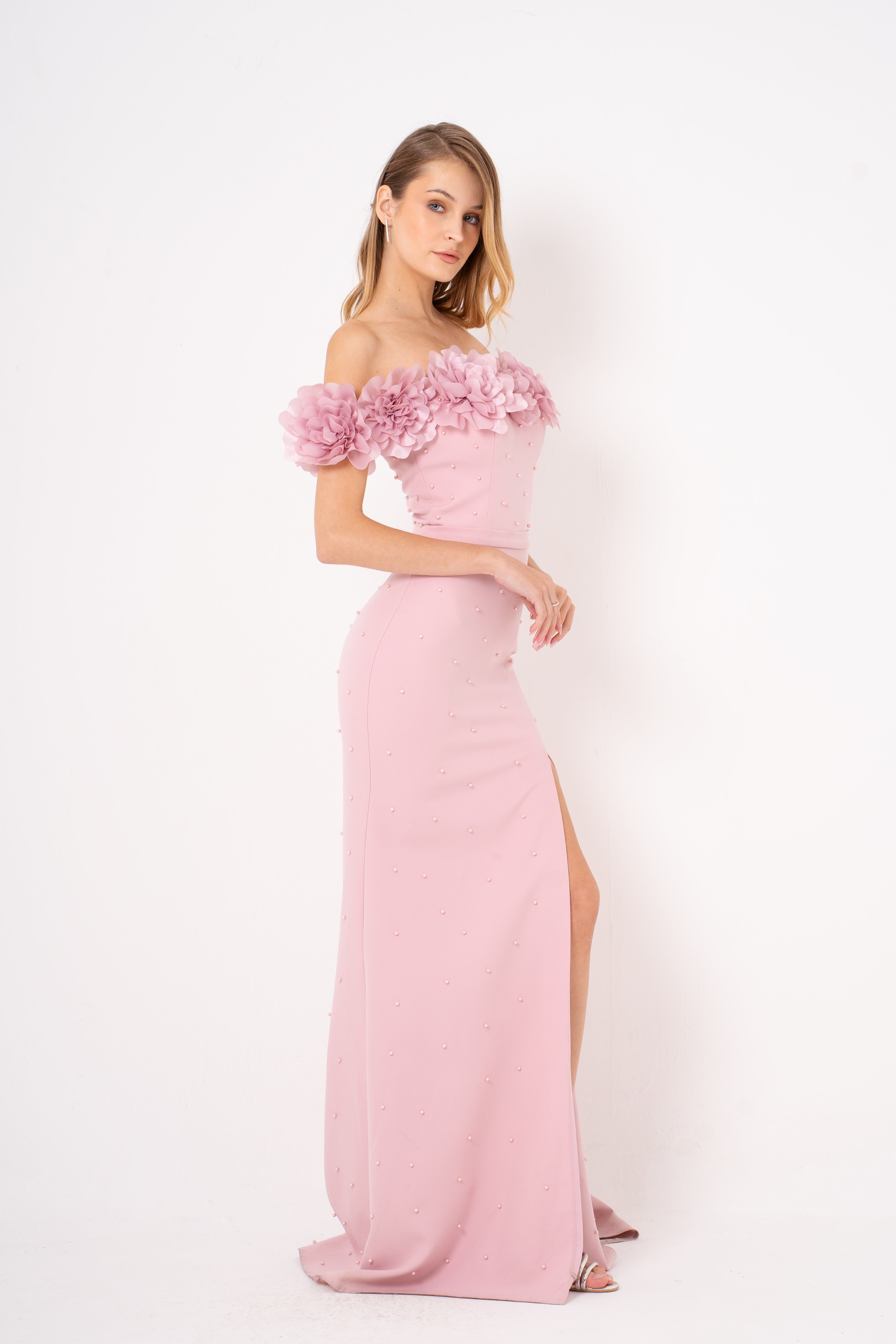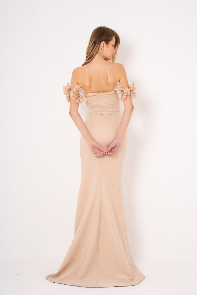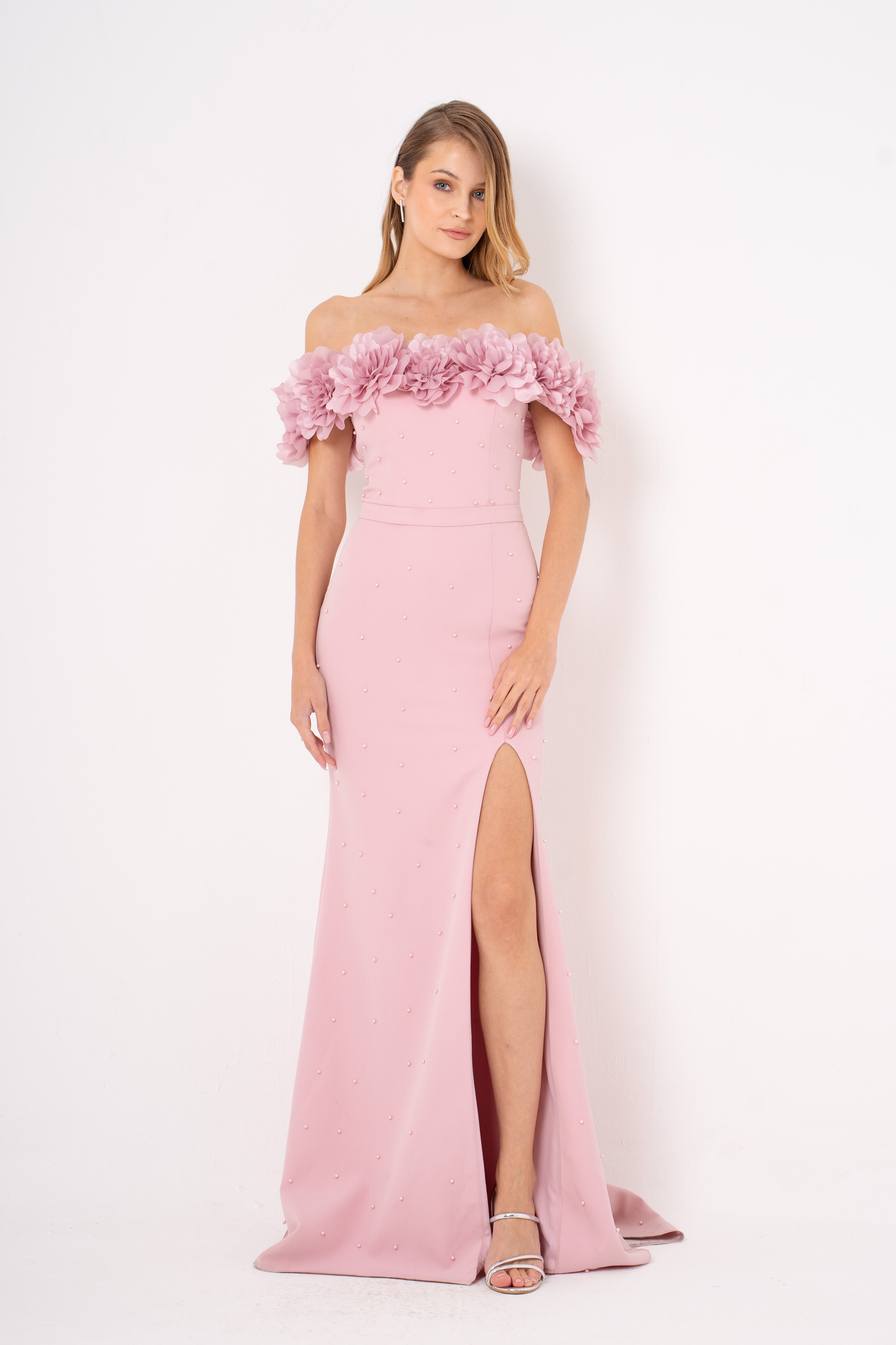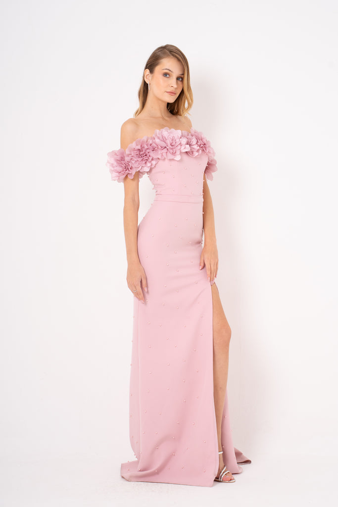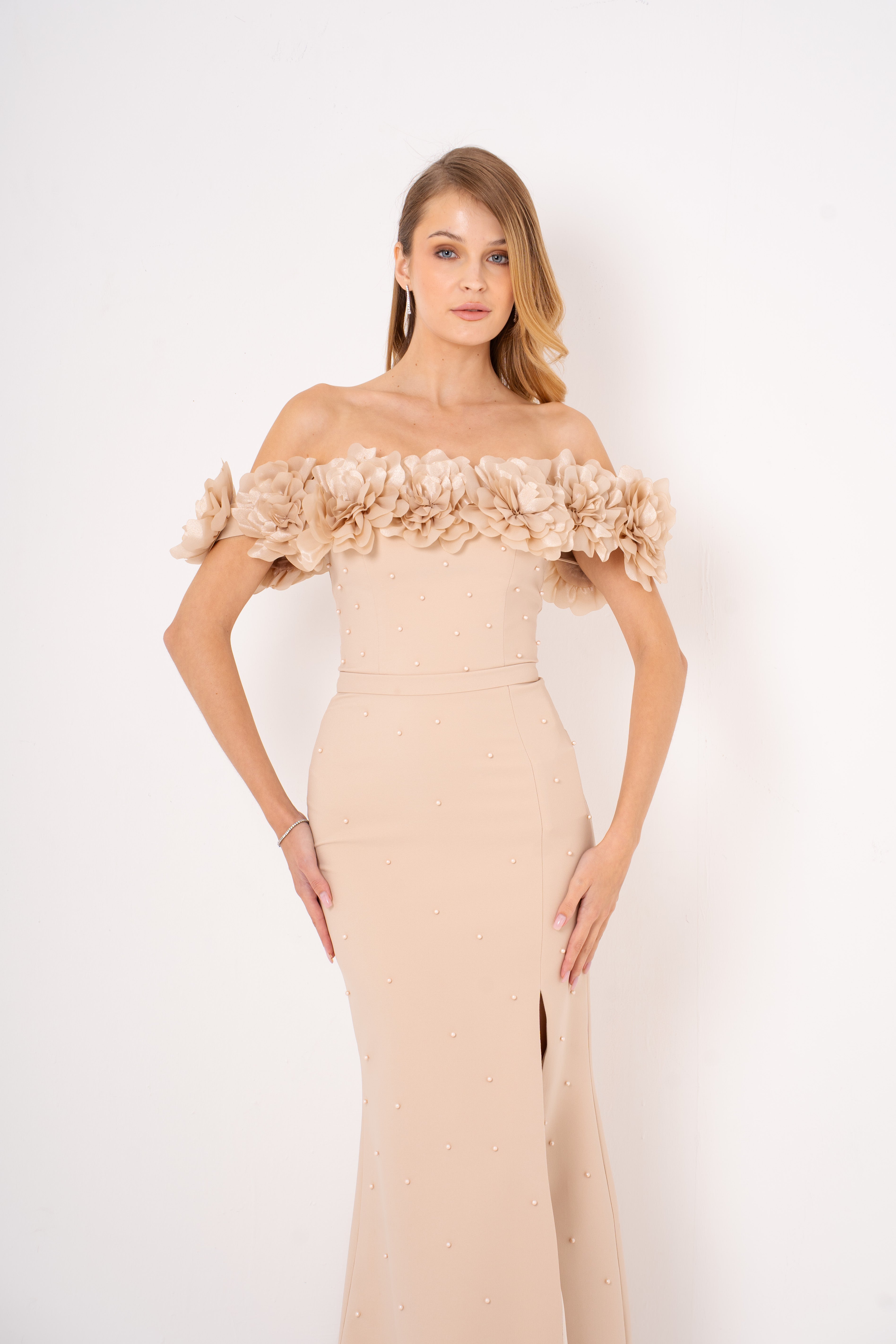 Introducing Sheere - the flower-powered maxi! Show off those shoulders and legs with this flirty and feminine off-the-shoulder dress featuring a high slit. Perfect for a romantic date or a night out with friends. Get ready to turn heads and bloom with confidence.