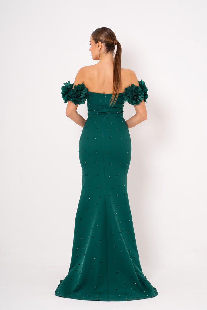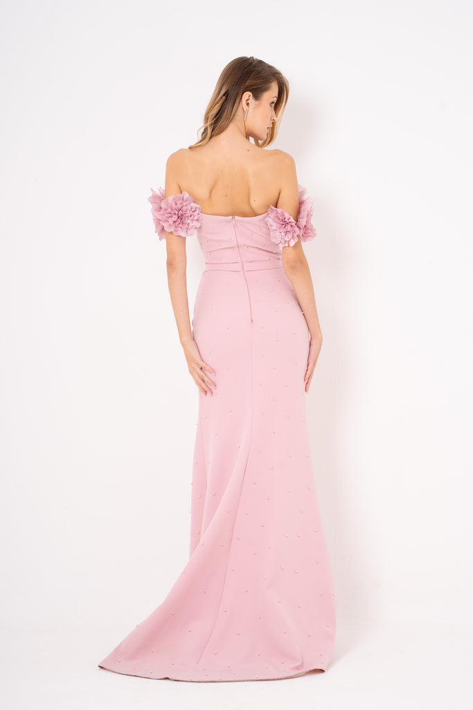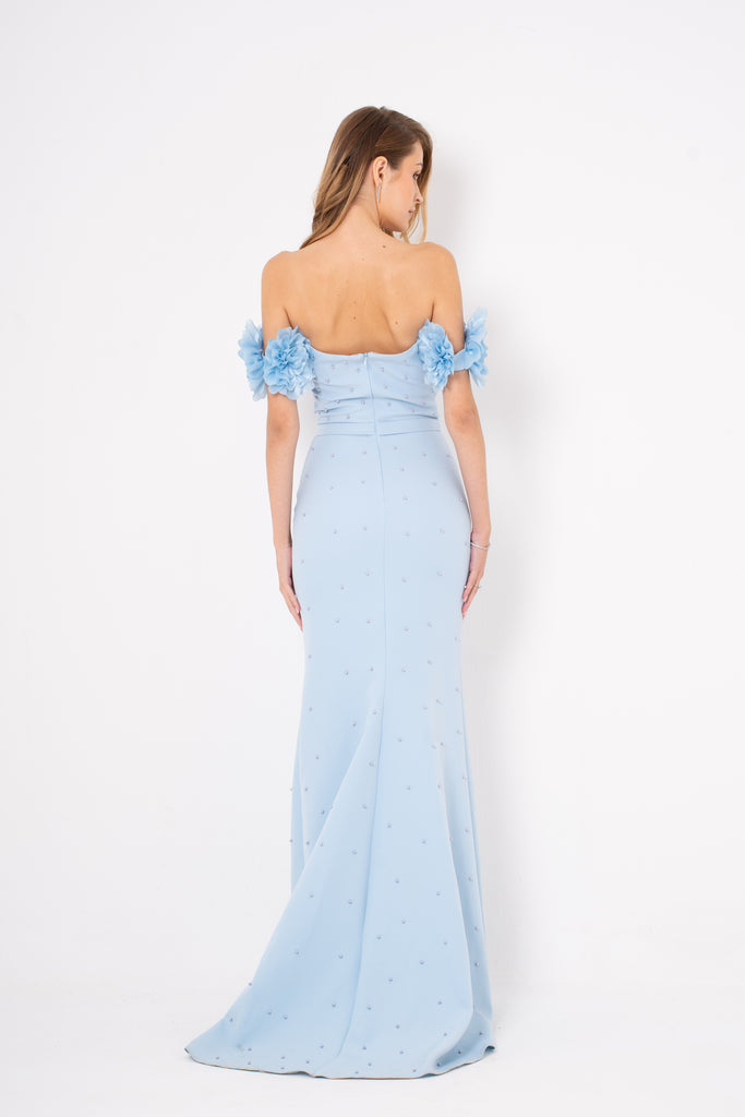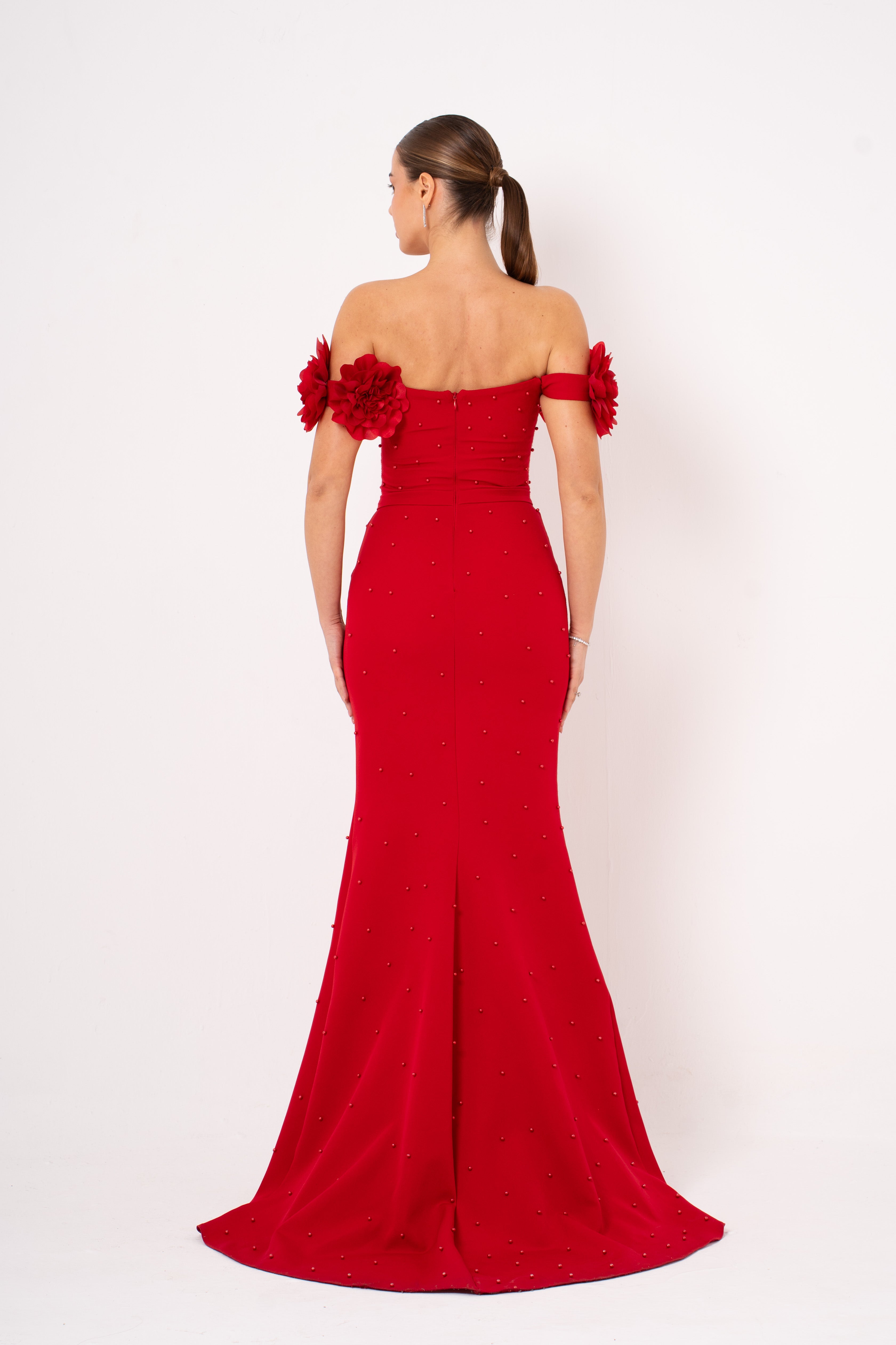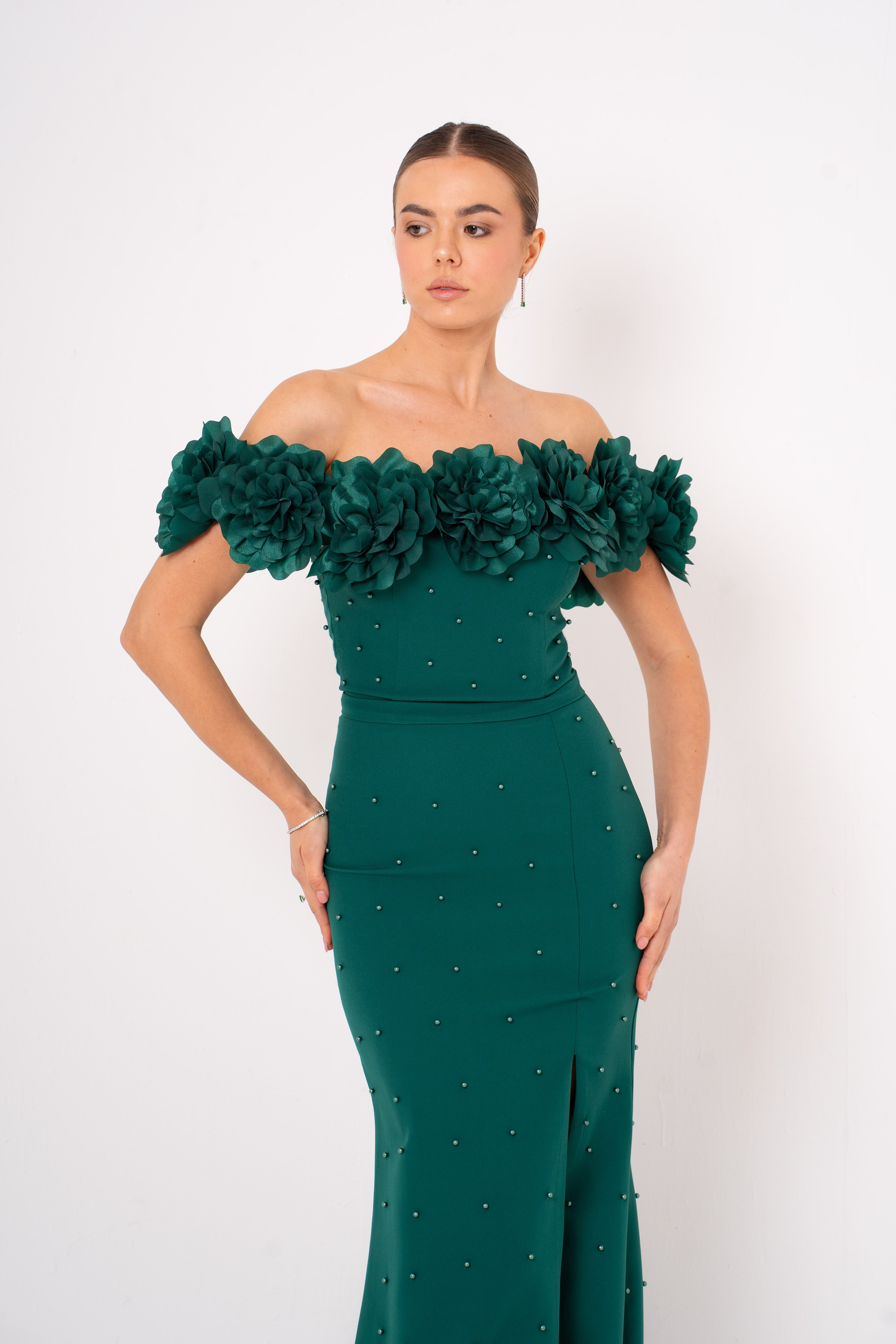 Introducing Sheere - the flower-powered maxi! Show off those shoulders and legs with this flirty and feminine off-the-shoulder dress featuring a high slit. Perfect for a romantic date or a night out with friends. Get ready to turn heads and bloom with confidence.