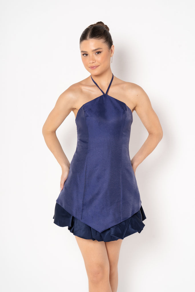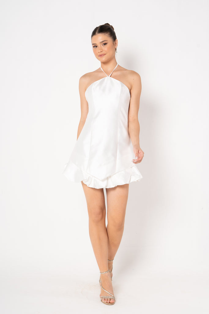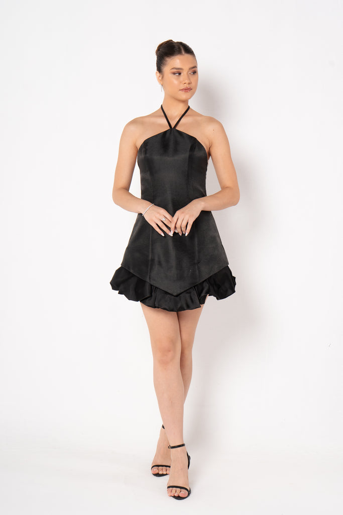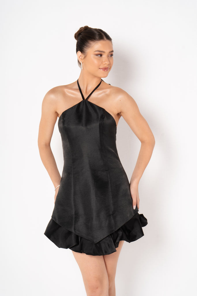 Take your wardrobe to the next level with Madelyn, the halter neck mini dress that is anything but ordinary. Made from luxurious taffeta material, the playful ruffles hem adds a touch of whimsy to this must-have piece. Perfect for any occasion, this dress is sure to turn heads!