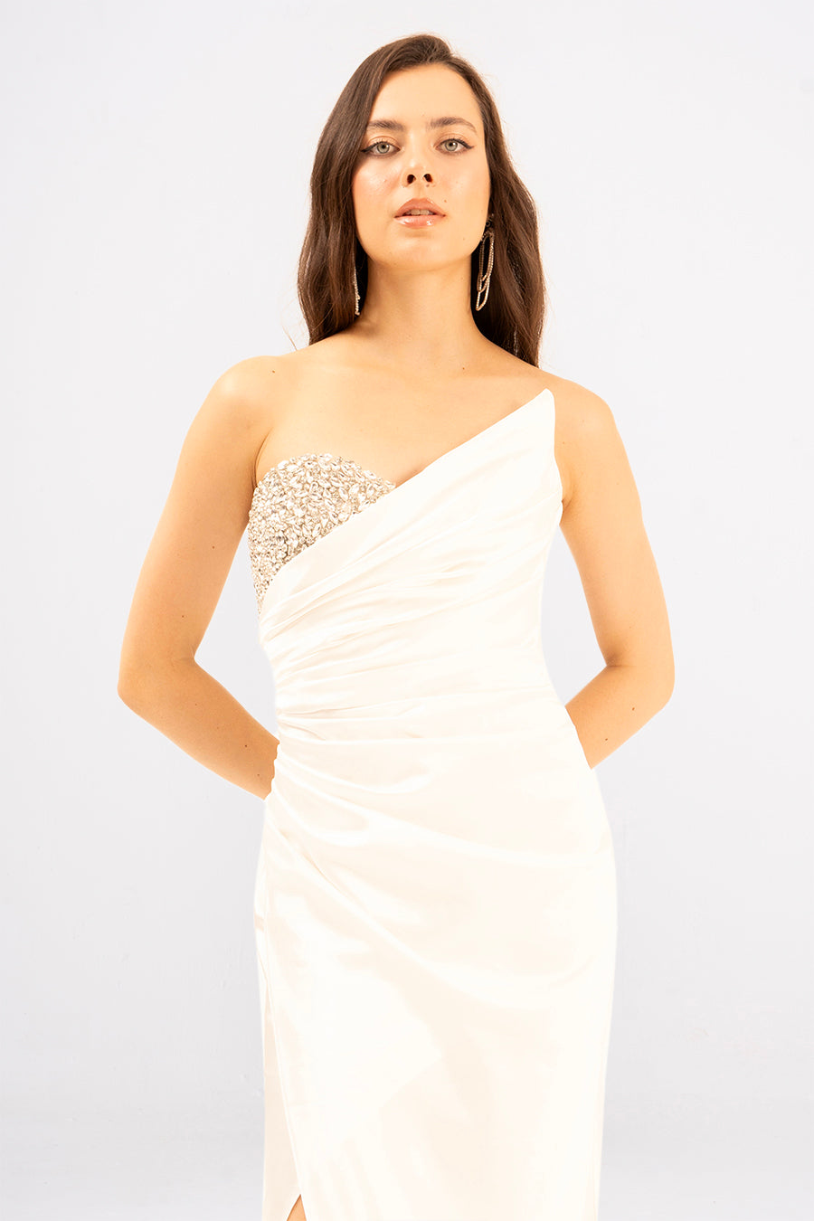Elevate your evening game with Lumira, the strapless maxi that's equal parts glamorous and daring. This showstopper features a sleek silhouette that hugs in all the right places, topped with a chic strapless neckline for effortless sophistication. The high slit? Pure drama—designed to let you move with confidence and turn heads as you walk. Perfect for galas, celebrations, or any night that calls for a little extra sparkle and sass.