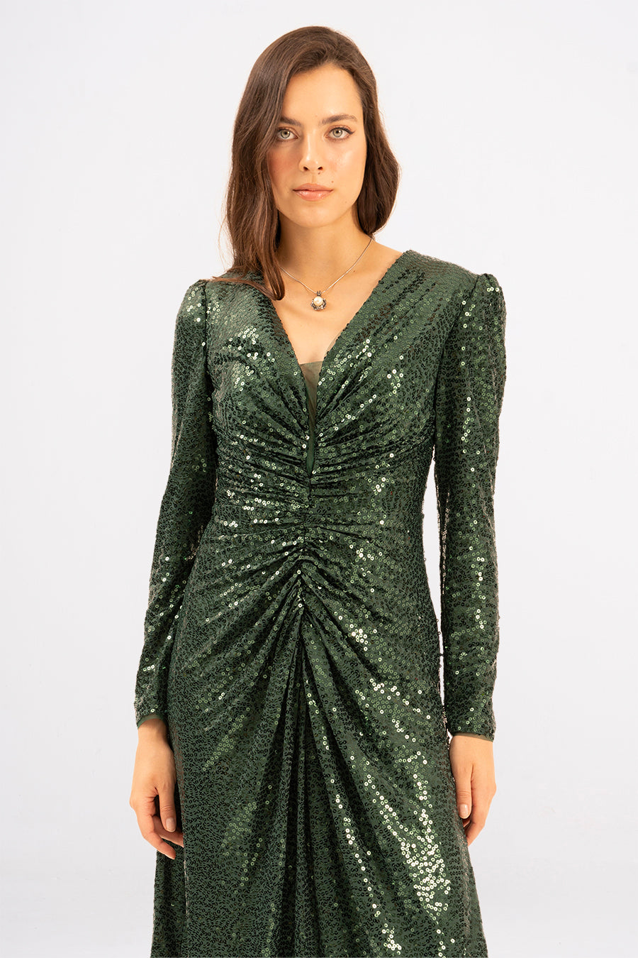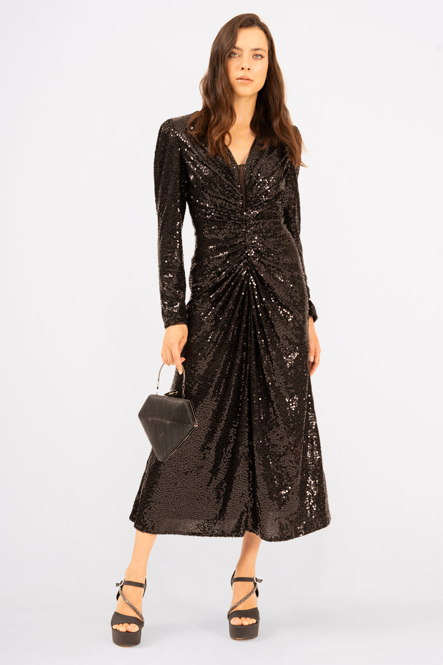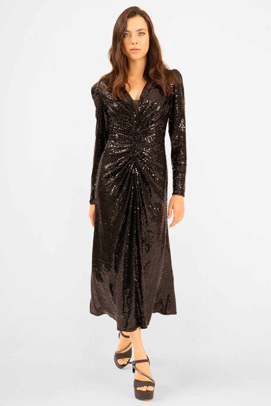 Introducing Néxelle, the dress that turns heads and steals the spotlight. This stunning midi evening dress features luxurious sequined material that catches every light, creating a mesmerizing shimmer with your every move. The elegant long sleeves provide sophisticated coverage while maintaining that show-stopping glamour you crave. Perfect for galas, celebrations, or any occasion where you want to feel absolutely radiant. Slip into Néxelle and let your confidence sparkle as brightly as the sequins.