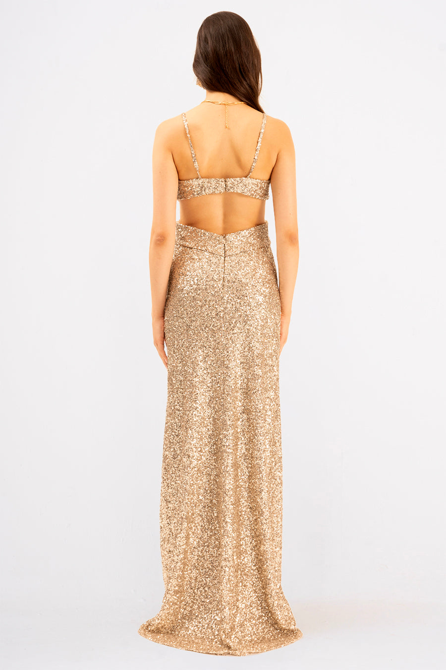 Qelina is your ticket to turning heads at any evening event. This stunning sleeveless maxi dress features an alluring open back design that's equal parts elegant and daring, paired with a dramatic high slit for effortless movement and show-stopping style. Crafted from shimmering sequined material, every step catches the light beautifully. Perfect for those moments when you want to feel absolutely fabulous and unforgettable.