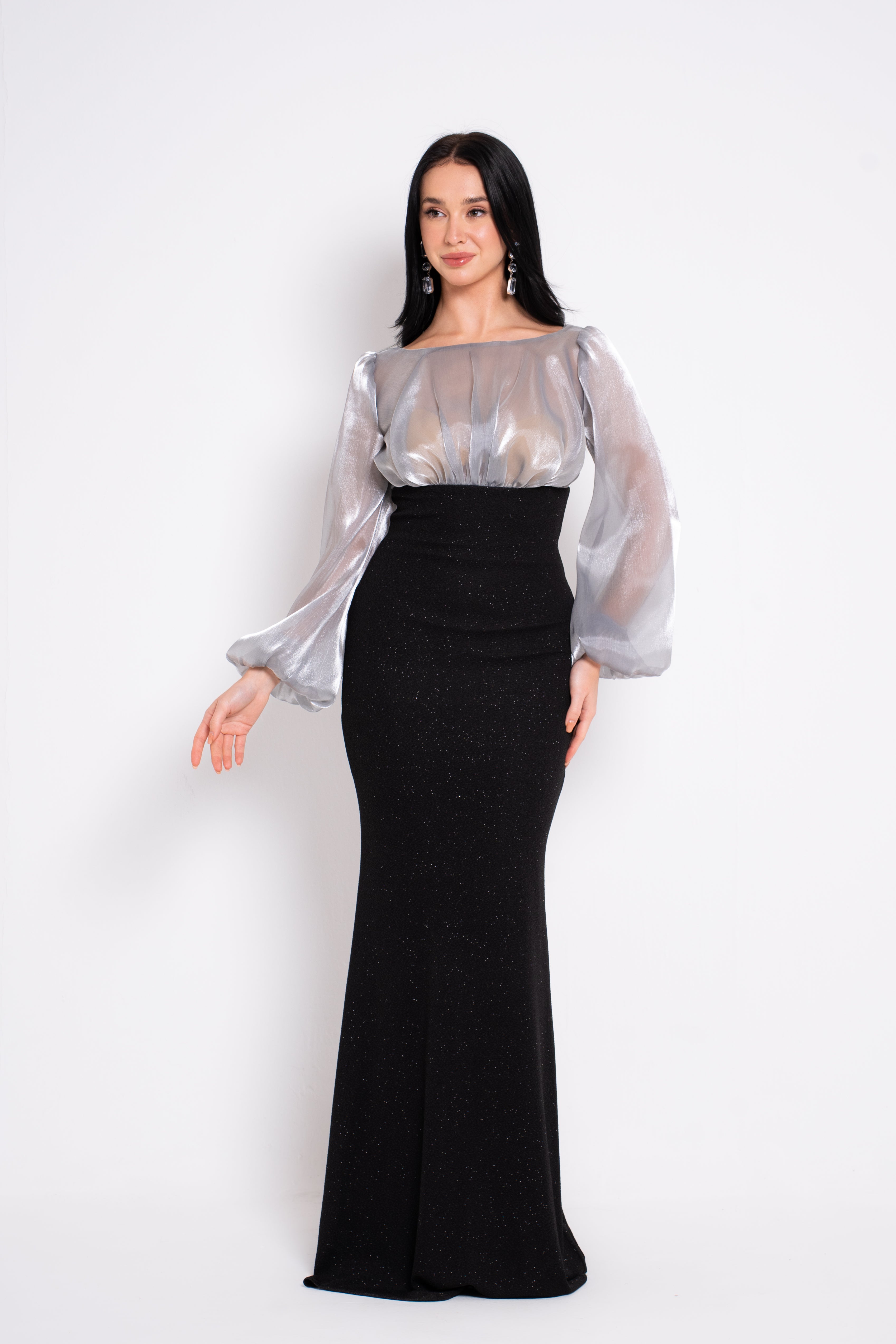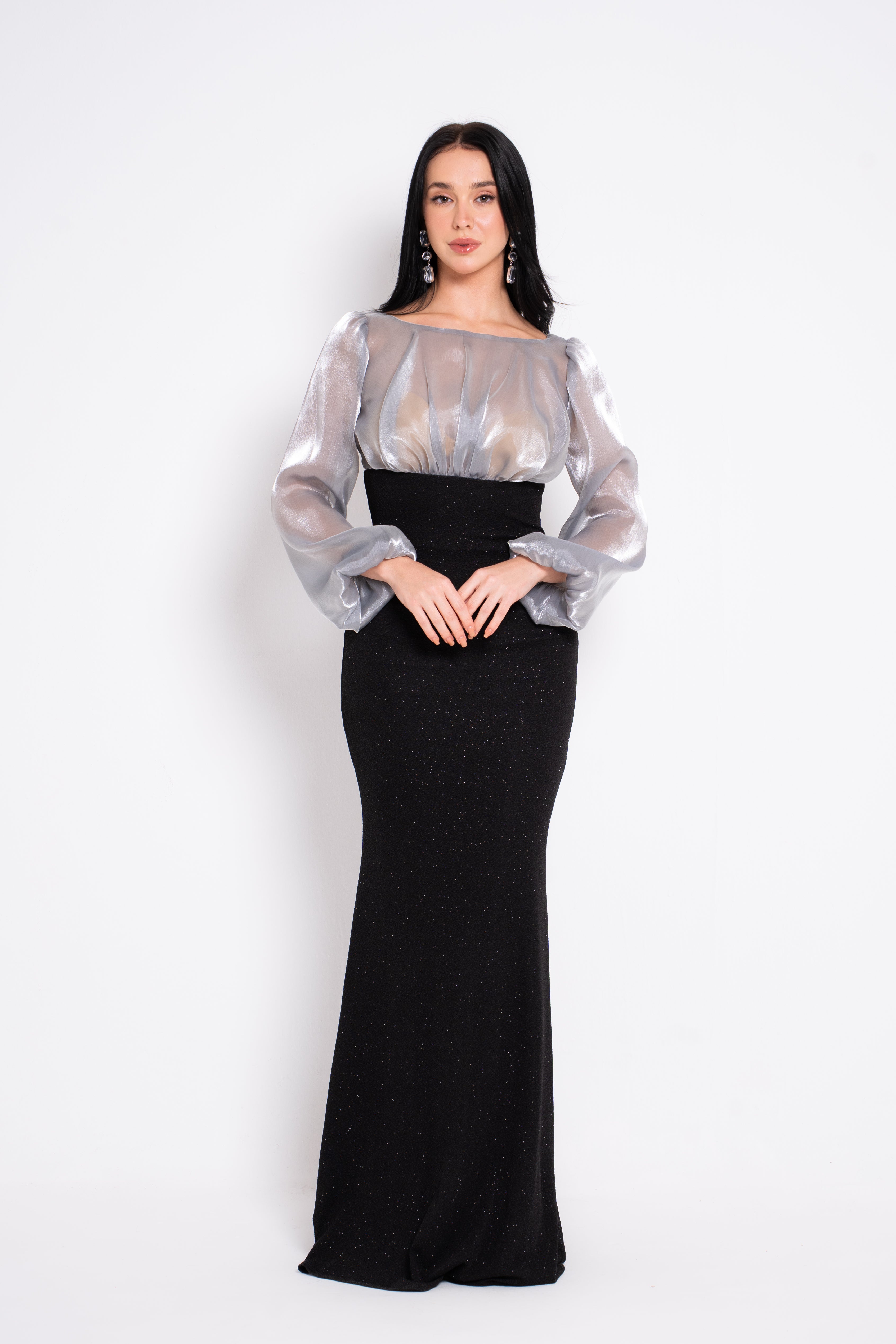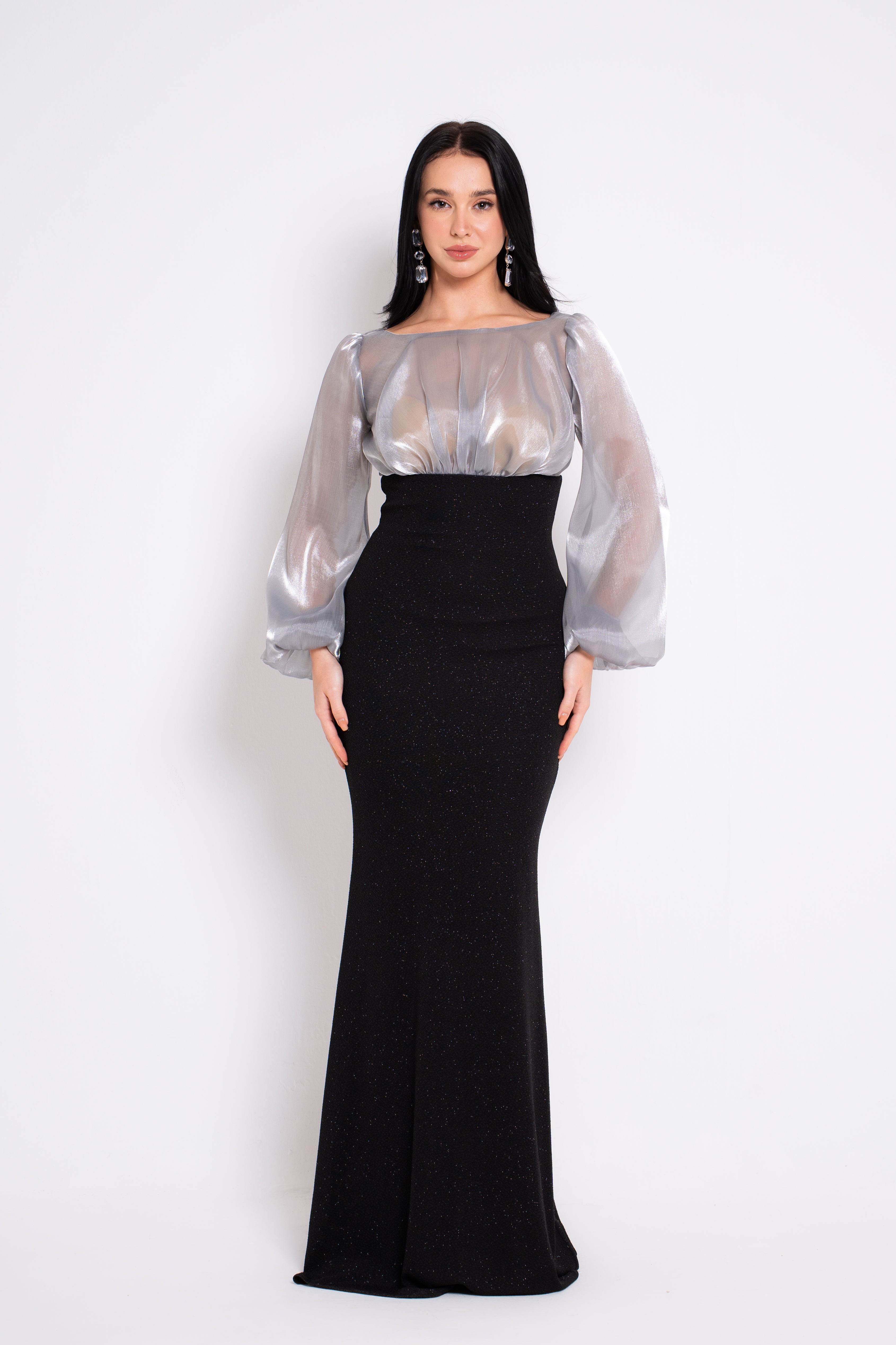 Get ready to dazzle in the Esraa maxi dress! With long organza sleeves and bodice. The glitter jersey mermaid skirt adds a touch of sparkle while keeping you comfortable. Stand out from the crowd with this stunning dress.